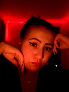 Alice, a young woman, is captured in this image, exuding an air of contemplation. Her hand gently holds her chin as she gazes off to the side. She's positioned in a room that boasts neon accents on the ceiling, adding a vibrant contrast to her casual attire. Her expression suggests deep thought or perhaps anticipation. The overall scene is relaxed and inviting.