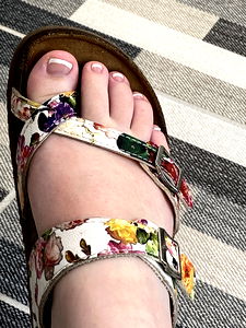 Alicia flaunts her summer footwear, a fashionable pair of sandals paired with pedicured toes. She's ready for a day at the beach!