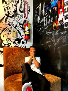 Award-winning rapper Yabdiel standing in front of a wall with graffiti and signage, including a fan bus logo. He is posing confidently for the camera with a microphone around his neck.