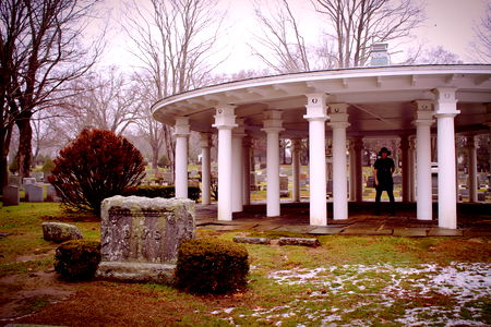 A tranquil scene at a cemetery, featuring a white gazebo and gravestones under a clear sky. A person can be seen in the background.