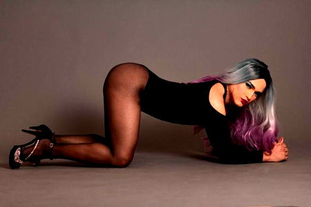 Striking a seductive pose, Alina foXXx stands out with her unique purple hair and confident posture in this professional portrait. OnlyFans model from California.