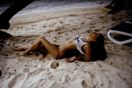 This image captures a young woman, approximately 22 years old, striking a pose outdoors on a sunny day. The high-resolution image showcases her in a fashionable bikini ensemble. The swimwear is a two-piece swimsuit, consisting of a bikini top and a swimsuit bottom. The bikini top closely resembles a brassiere in design, while the swimsuit bottom is more akin to panties or underpants. The model's navel and abdomen are prominent in the image, drawing attention to her flat stomach. Her thighs are also visible, further enhancing the beach-ready vibe of the shot. The model's face is clear and expressive, contributing to the overall aesthetic of the photo. The setting appears to be a beach with a clear blue sky overhead, adding a summery, outdoor feel to the image. The ground beneath the model suggests sandy beach terrain. The photo appears to be part of a professional photo shoot, possibly for a swimwear or lingerie line. The model's stylish swimwear and the beach setting create a vibrant, summer-themed image.