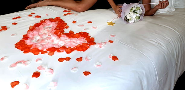 In the image, a beautiful model named Alina x Mark is seen lying on a bed with red rose petals around her. She is wearing a matching red dress and holding a white bouquet of flowers. The atmosphere suggests a romantic setting, possibly a Valentine's Day theme or a special occasion. The model is looking directly at the camera, capturing the viewer's attention with her radiant smile.