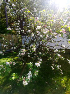 Vibrant spring tree with blooming flowers, a serene backyard setting.
