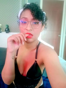 An intriguing model with striking black hair, donning a pair of glasses and a bold red lipstick. She's captured in an artistic pose, possibly in her home or studio. Her unique style adds to the allure of the photo.