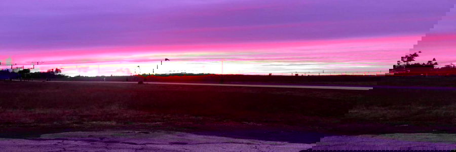 This image captures the serene moment of a sunset over an airport runway. The sky is painted with hues of purple and pink, creating a stunning backdrop to the airfield. The tranquility and calmness of the scene evoke a sense of peace and solitude.