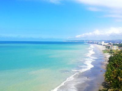 A serene image of Andrea enjoying a sunny day on the beach. With the sand beneath her feet and the ocean as her view, she embodies tranquility. The clear blue sky above further enhances this peaceful scene.