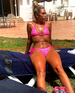 A stunning image of the UK-based model Alittlebitforeign showcasing her incredible figure in a skimpy bikini with tattoos, on a sunny day. Her tan lines suggest she's been enjoying the outdoors. She is seen posing confidently for the camera.