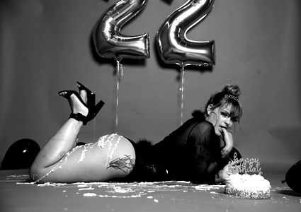 Liv, a popular OnlyFans model, is seen in a glamorous shoot, dressed in a black lingerie set with a playful hat on her head. Her pose suggests a sense of fun and confidence as she strikes a pose in front of the mirror. She appears to be at a photo shoot, surrounded by professional lighting and equipment, indicating a professional setting. The image captures her allure and the glamorous atmosphere of the photoshoot.