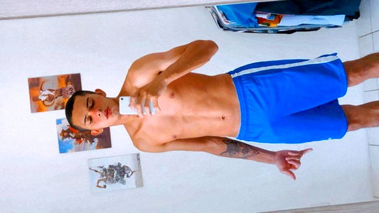 A young man with tattoos taking a selfie, showcasing his well-defined physique and tattooed arms. He is topless and posing from a low angle.