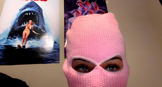 The image showcases a model with a humorous take on wearing a knitted mask, complete with a shark headband. The model is posing in front of a poster for JAWS, adding a touch of whimsy to the scene. This light-hearted image captures the playful and fun aspect of the model's persona.