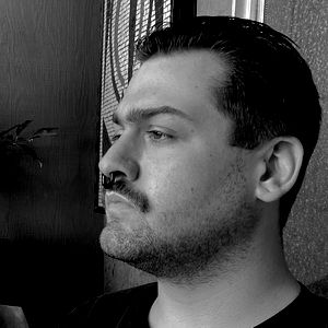 The man in the image is sporting a well-groomed mustache and goatee, with his hair neatly combed. He has a serious expression on his face, and it appears that he might be deep in thought or contemplating something. The background of the photo suggests an urban setting, possibly near a coffee shop or restaurant due to the presence of outdoor furniture.