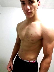 Young male model in a gym setting, shirtless and showcasing physique. Allan is from Brazil.