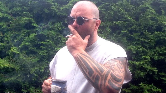 In this black and white photograph, a bearded man is seated at a table, leaning forward with his left arm resting on the table. His tattoos, including those visible on his forearms, contribute to a rugged and possibly artistic or creative persona. The image captures a candid moment of introspection or contemplation.