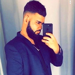 A fitness model posing confidently for a selfie in a tailored suit, showcasing his well-groomed beard and physique.