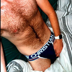 Allen Redding, a Nebraska-born model, is captured here in an intimate moment showcasing his physique. He is wearing matching swimwear from the 'Christian' brand. This image seems to be taken in a private setting with a casual and relaxed atmosphere.