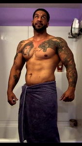 Photogenic Omarsworld from Pennsylvania, confidently showcasing his physique and playful demeanor. Aged 35 years, the model is dressed in a tight white tank top, flaunting his muscular arms and chiseled features. His pose against the orange wall suggests a fun and relaxed ambiance.