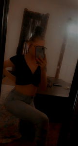 A young woman posing for a selfie. She is standing against a blurred background, holding her phone with a playful smile. Her attire consists of a cozy sweater layered over a tank top and blue jeans.