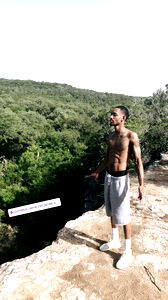 A young man stands confidently at a scenic overlook, possibly in Texas, taking in the view. He is wearing casual attire with a noticeable chain necklace and a tattoo on his wrist. The background suggests a warm climate, and the sky appears overcast.