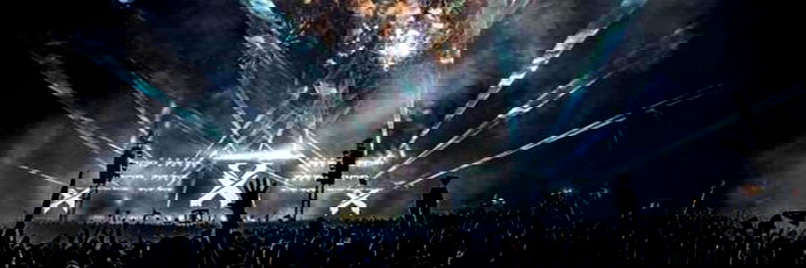 A large, packed concert venue at night with a vibrant atmosphere. The stage has multiple lights and colorful lasers creating an energetic ambiance.