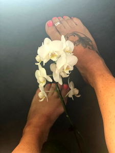 Caught in a candid moment, Alyssa showcases her elegance with a beautiful white flower resting on her foot. Her Australia roots are evident in the natural light illuminating the image. The flower stands out against her skin tone, creating a visually striking contrast.
