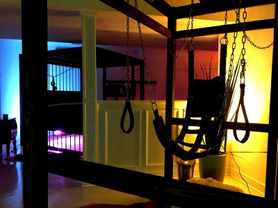 A modern bedroom featuring black and white design elements, with a unique bungee setup. Jose's OnlyFans room has an erotic atmosphere, with various accessories such as handcuffs and a whip.