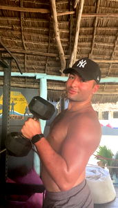 This image showcases Brook Dalton, a fitness enthusiast from Kansas, who is passionate about strength training and powerlifting. In the photo, he is seen flexing his muscles with a dumbbell in hand, displaying his commitment to his health goals.