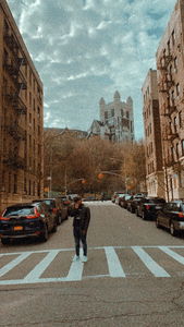 This image captures a moment of urban life, featuring a man walking across a city street at an intersection. He is positioned in the center of the frame, with buildings and cars visible behind him. The sky is partly cloudy, suggesting it might be early morning or late afternoon. There are no distinct features that would allow for a more detailed description.