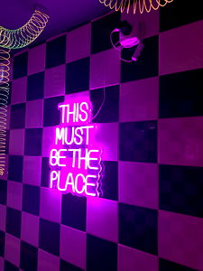 The image showcases a purple neon sign that proudly declares 'This Must Be The Place', set against a backdrop of a checkered wall. This is a unique and eye-catching statement piece, perfect for creating a distinct atmosphere in any room. With its bright pink letters standing out against the neon background, this sign is sure to be a conversation starter. It's a great addition to your home or business decor.
