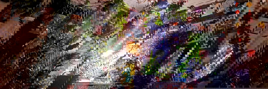 A room filled with potted plants and various decorative items, creating a lush and inviting atmosphere. The space is personalized with pictures and trinkets, reflecting the unique taste of its occupant.