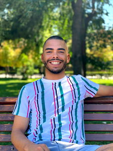 A young man, Mark, is seen sitting on a bench with a bright smile. He's dressed casually in a colorful striped shirt and has short hair. He's looking directly into the camera with his arms crossed over his chest, exuding confidence.