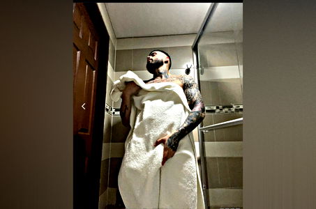 This is an image of OnlyFans model, Junior. The model is a young man with tattoos and a beard. He appears to be relaxed at home in casual attire, wearing white shorts and a t-shirt. His pose suggests confidence and comfort. A notable detail is the engagement ring he's wearing, hinting at a significant relationship status.