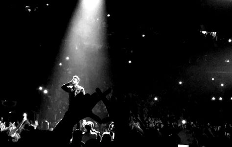 Early Mac, the artist formerly known as Mac Miller, is performing in front of an enthusiastic audience. The image captures him mid-performance with the crowd watching intently. His stage presence is evident, and he seems to be enjoying his time under the bright lights.