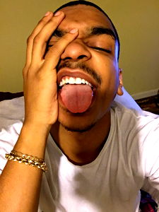 A candid shot of the OnlyFans model SlimNotSmall, posing with his hand near his mouth. He's dressed in a casual outfit and is sitting in front of what appears to be an indoor setting.