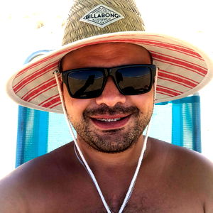 An image of a man with facial hair, wearing a white tank top. He is standing in what appears to be a kitchen, smiling at the camera. The man has short hair and is looking directly into the lens.