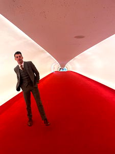 The model is posing with confidence on a red ramp. The setting appears to be a modern and stylish indoor venue.
