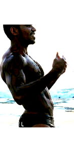 In this dynamic photo, Alor is captured in the midst of a workout, exhibiting his strength and physique. The setting suggests a day at the beach in Bali, Indonesia. His powerful stance and athletic build are highlighted against the backdrop of the ocean.