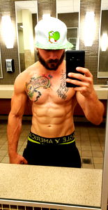 Alpha103, a dedicated fitness enthusiast, showcases his intense workout routine, capturing his muscular physique in the gym mirror. His dedication to bodybuilding is evident, with visible veins and well-defined muscles. In this snapshot, he's flexing his biceps, emphasizing his impressive strength.