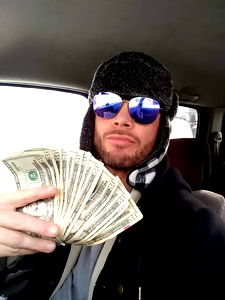 Doug Melby, a rock musician from Minnesota, showcases his tattoos and gives the peace sign in this truck driving selfie. Onlyfans model.