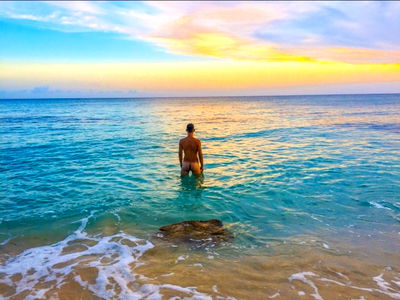 Meet Alpha Cock, a fitness buff who enjoys staying active and maintaining his physique. In this image, he's relaxing by the pool at sunset, showing off his toned muscles and swimwear-ready body.