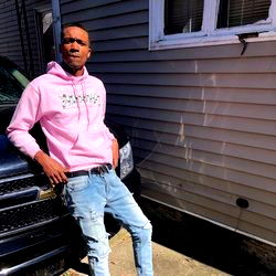 An outdoor photoshoot of Alpha Ant, a model posing in front of a car with a casual style. The model is leaning against the vehicle and wearing a pink hoodie with jeans.