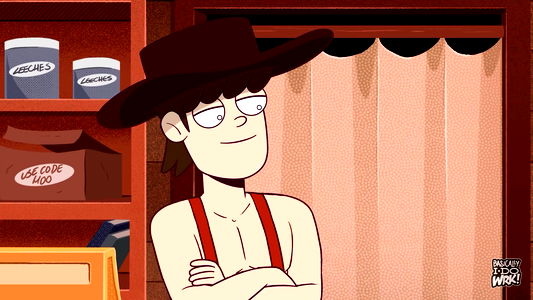 The image is a colorful cartoon of a character who appears to be in their twenties or thirties, with light skin and short, dark hair. The character is shown with a surprised or contemplative expression, leaning slightly forward with arms crossed over their chest. They are wearing a brown cowboy hat, a sleeveless vest, and what seems to be suspenders or a harness, suggesting a casual or informal attire, perhaps associated with work in a workshop or similar setting. The character is standing inside a shop or store, with shelves stocked with various items in the background, hinting at a thematic connection to either cowboy culture or mechanics/workshop environment.