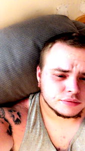 A muscular and tattooed man lies on a bed in a bedroom with plain walls. He wears a tank top, and his tattoos are visible. His expression is serious.