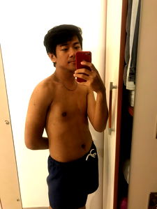 Rome-based model Mikey shares a strong and defined physique. He embodies confidence with his gym-honed body. Candid shot of Mikey in front of mirror, holding a phone.