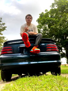 A young Caucasian male sitting on the hood of a blue car with red and blue shoe colors. He has long hair and appears to be in his late teens or early twenties.