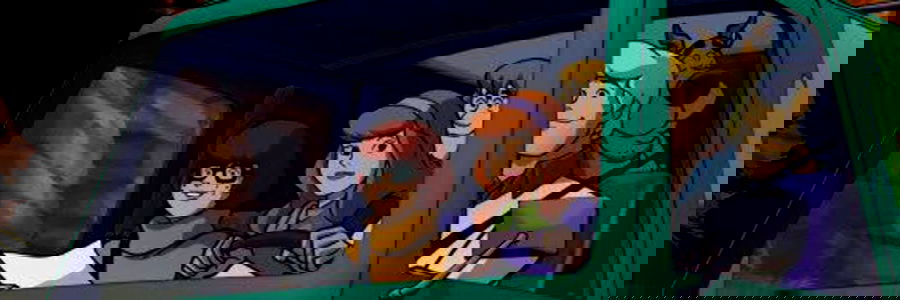 A model posed inside a playful, cartoon-style vehicle with vibrant colors and an old-fashioned design. A family of four is seated within the car, each showing expressions of joy or surprise. The setting suggests a lively scene from an animated film or TV show.