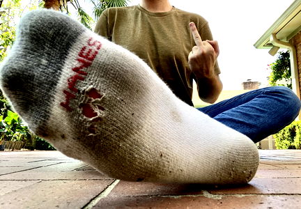 This is an image of a person sitting on the floor, wearing a sports jersey and holding up a pair of dirty socks. The individual appears to be in their late twenties or early thirties, with visible tattoos on their arm. They are not smiling, but there's a playful element to the photo due to the sock placement. Their gaze seems to be off-camera.