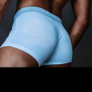 Model in blue briefs posing against a light background. The model is seated and adjusts their underwear with a casual, confident demeanor.