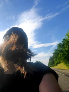 This is a photo of a bearded man, possibly in his mid to late adult years, wearing sunglasses and riding a motorcycle down the road. He has a beard and appears to be outdoors, as evidenced by the sky and foliage in the background. His attire suggests a preference for casual or biker clothing.