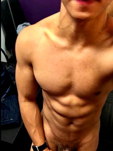 The image showcases the OnlyFans model in a gym setting, flexing his well-built physique. He is shirtless and the photo captures a selfie from a mirror.